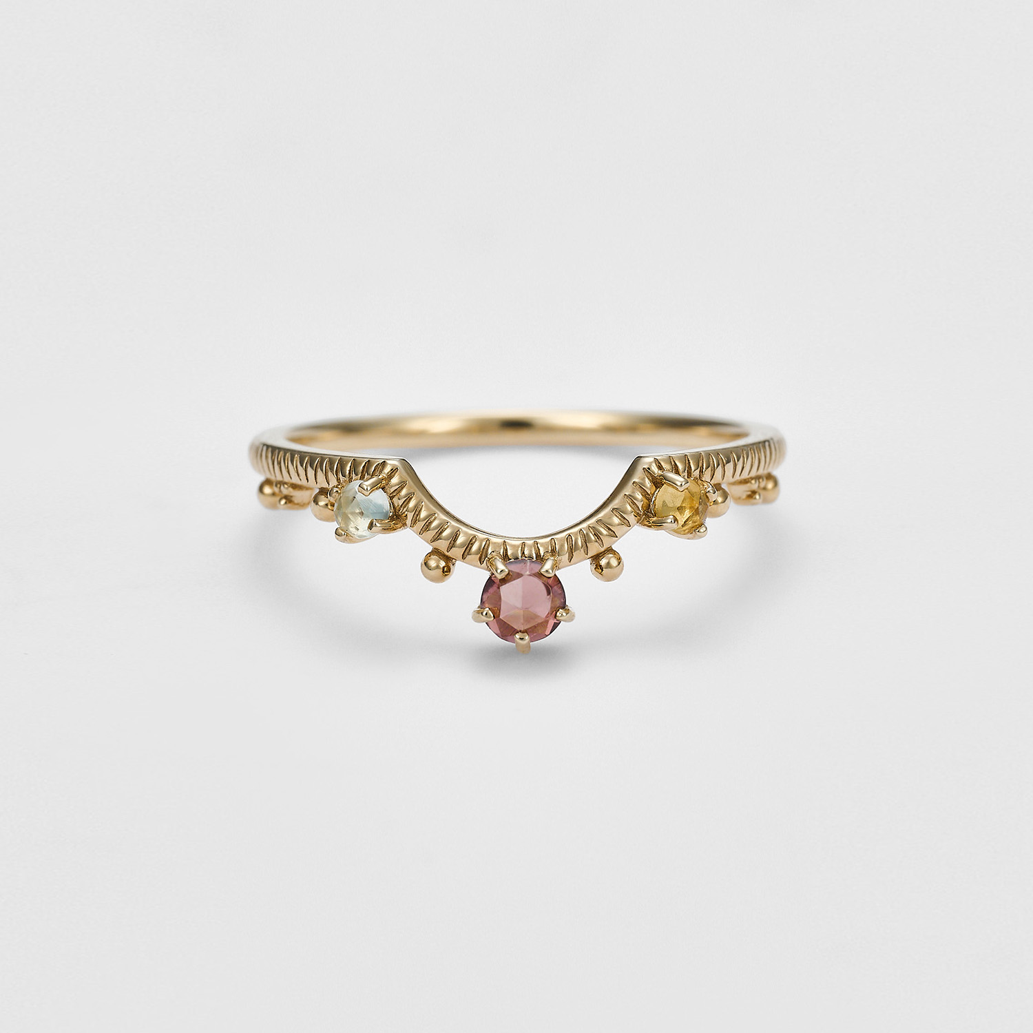 拉长石与蓝色托帕石贴合的双层宝石戒指、蓝色散发神秘韵味的光辉。以古董小物为灵感增添装饰。适度的份量感可以单独配戴也能与其它戒指叠戴。((德文)アーベント:Abend夜晚)
