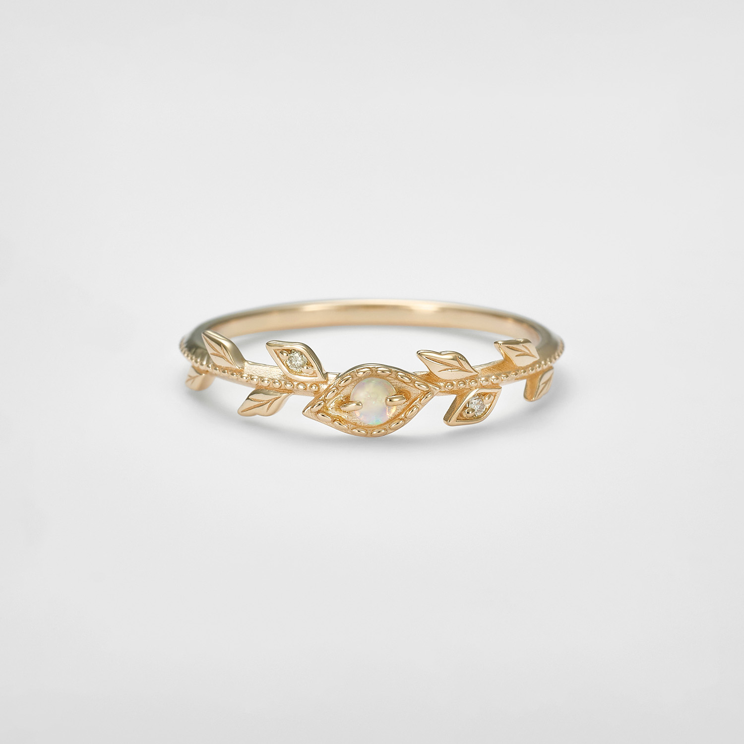 蛋白石独有的梦幻乳白色光泽之上,点缀着如晨露般晶莹的钻石,为整体光彩增添灵动韵致,让指尖綻放优雅气息。
